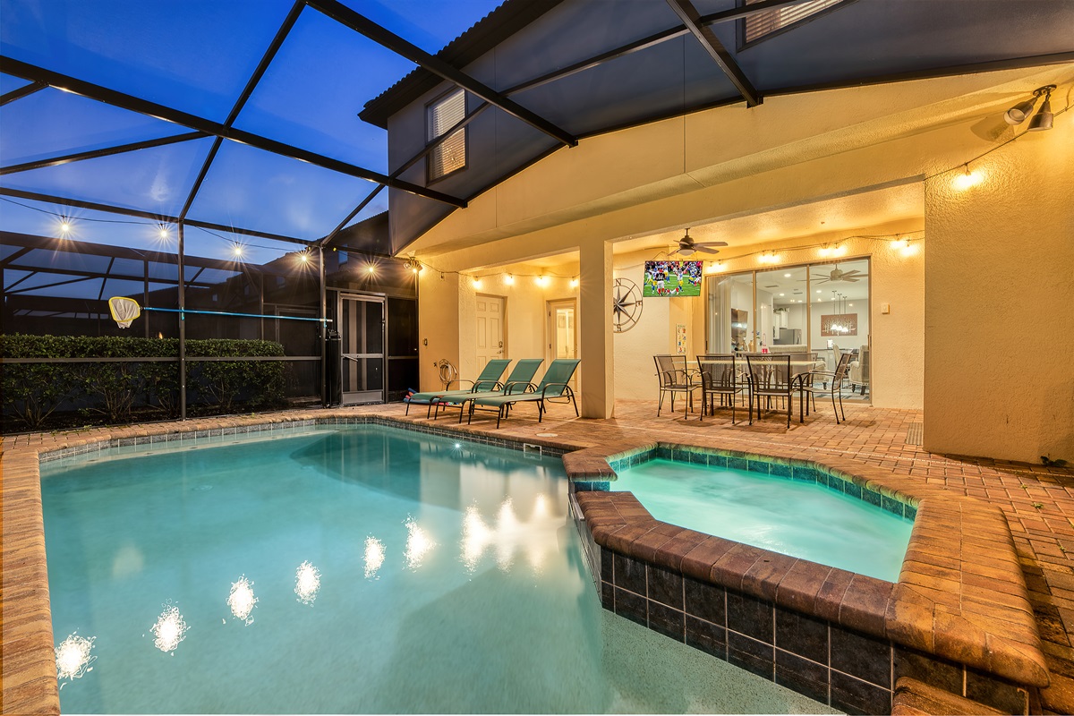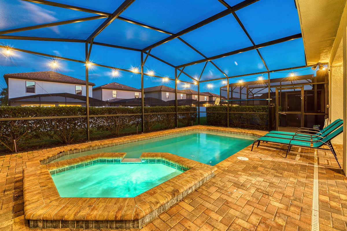 Indulge in the warm and inviting Florida weather by stepping out into your personal oasis, featuring a generously-sized swimming pool. Take a refreshing swim, unwind in the soothing spillover spa, or enjoy some friendly. Extend the fun with a full-day itinerary that includes delicious meals and snacks from the kitchen, complete with a built-in BBQ and a charming table for dining under the sheltered lanai equipped with TV.