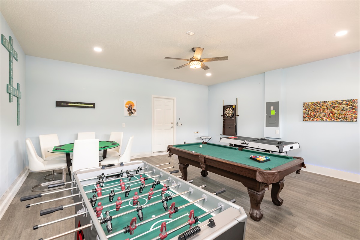 A fun-filled space designed to provide endless entertainment for you. The room features a foosball table, pool table, air hockey, and table tennis, offering a variety of games to suit everyone's interests. In addition, we have a six-person casino table that's perfect for a night of friendly gambling. The room is also equipped with a large TV, making it an ideal spot to watch your favorite sports or movies while enjoying some friendly competition. Come and enjoy the exciting atmosphere of our game room and make memories that will last a lifetime!