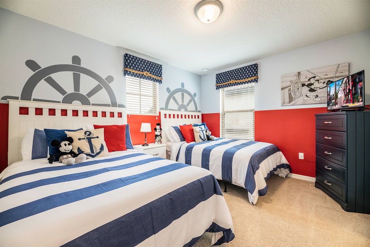The final bedroom has two full beds and a fun Mickey Mouse theme. As with all the other bedrooms, this also has its own bathroom with shower and sinks.